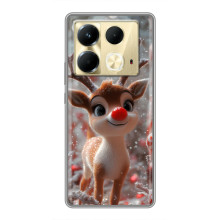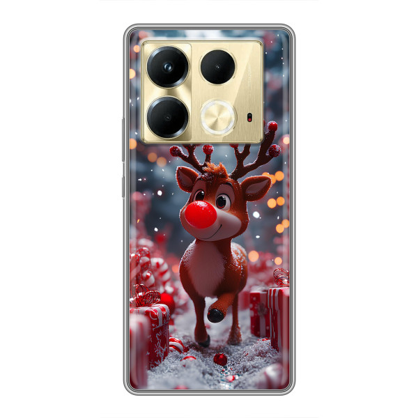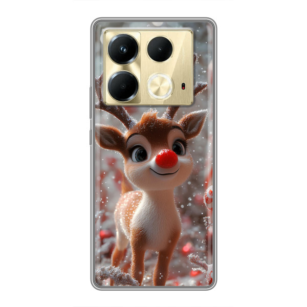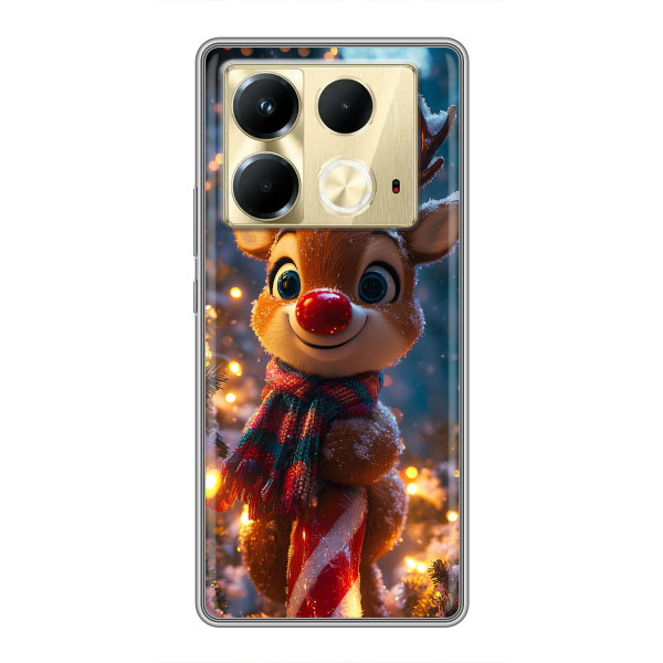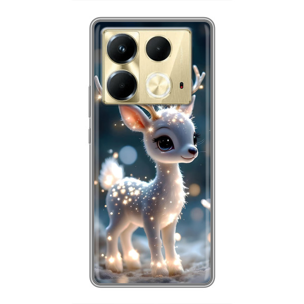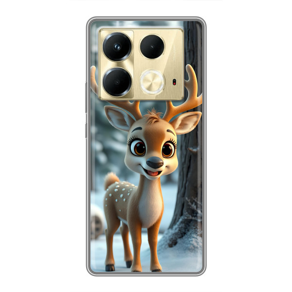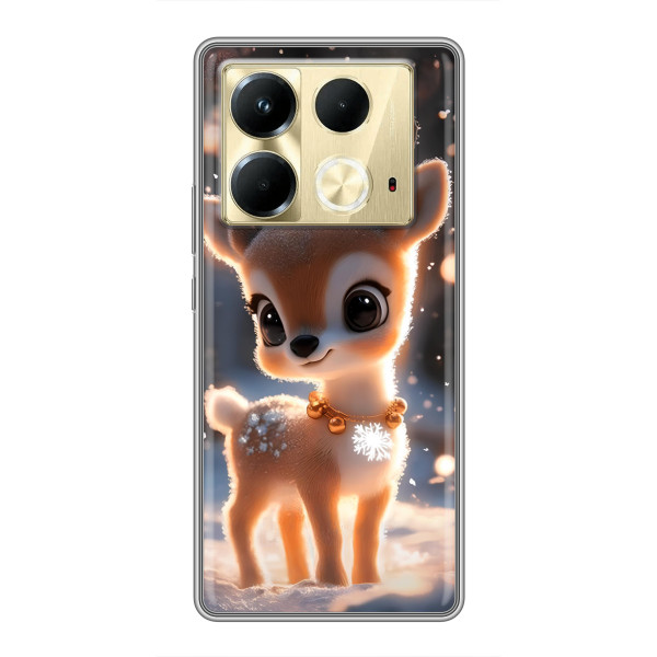 Зимняя коллекция принтов с тёплым сказочным настроением: Блестящий оленёнок, Олень в свитере, Олень с носом, Олень с шарфом, Олень среди подарков, Оленёнок в лесу, Оленёнок среди гирлянд, Оленёнок — выбери свой любимый дизайн для Infinix Note 40 (Инфиникс Ноут 40) и добавь праздничной магии каждый день.