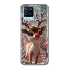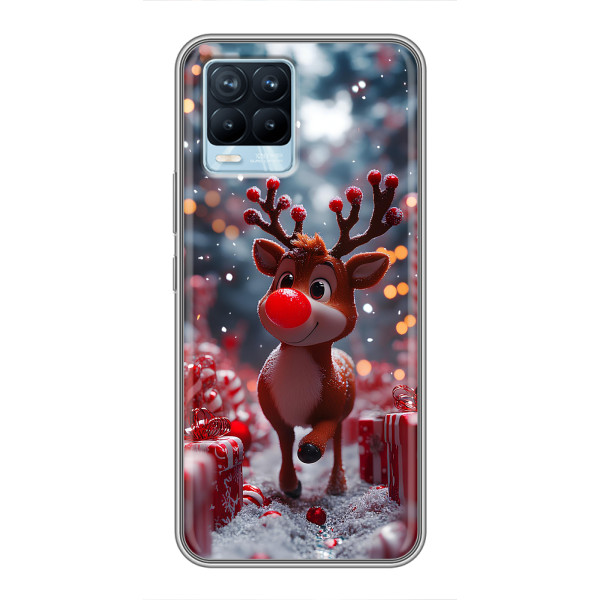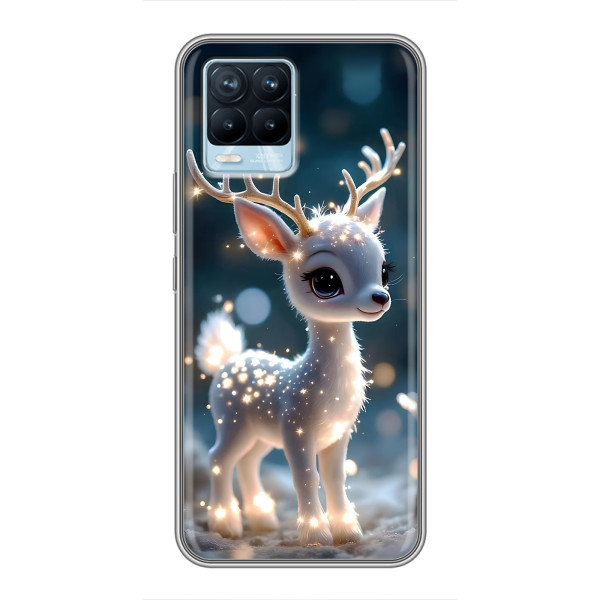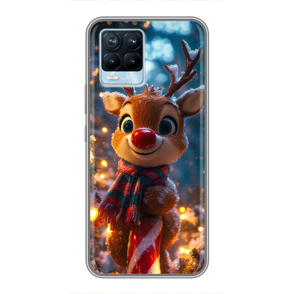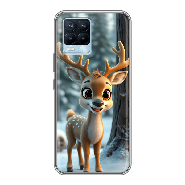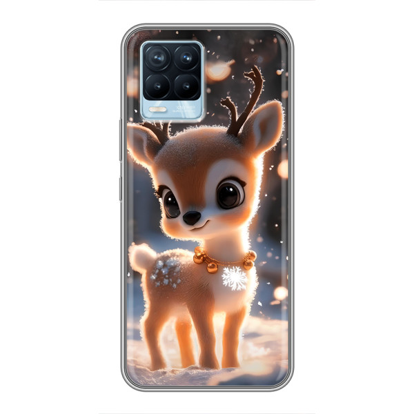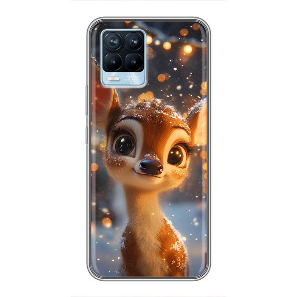 Зимняя коллекция принтов с тёплым сказочным настроением: Блестящий оленёнок, Олень в свитере, Олень с носом, Олень с шарфом, Олень среди подарков, Оленёнок в лесу, Оленёнок среди гирлянд, Оленёнок — выбери свой любимый дизайн для Realme 8 (Реалми 8) и добавь праздничной магии каждый день.