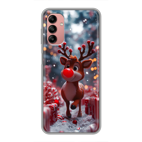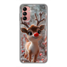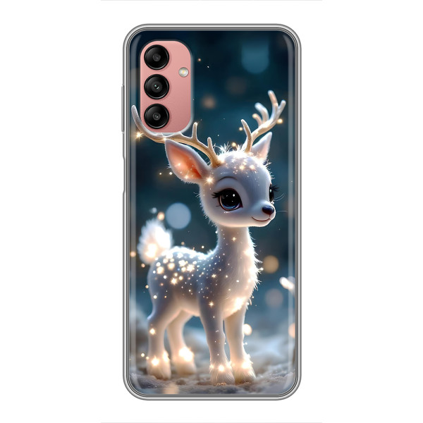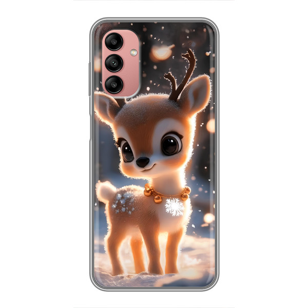 Зимняя коллекция принтов с тёплым сказочным настроением: Блестящий оленёнок, Олень в свитере, Олень с носом, Олень с шарфом, Олень среди подарков, Оленёнок в лесу, Оленёнок среди гирлянд, Оленёнок — выбери свой любимый дизайн для Samsung Galaxy A04s (Самсунг А04с) и добавь праздничной магии каждый день.