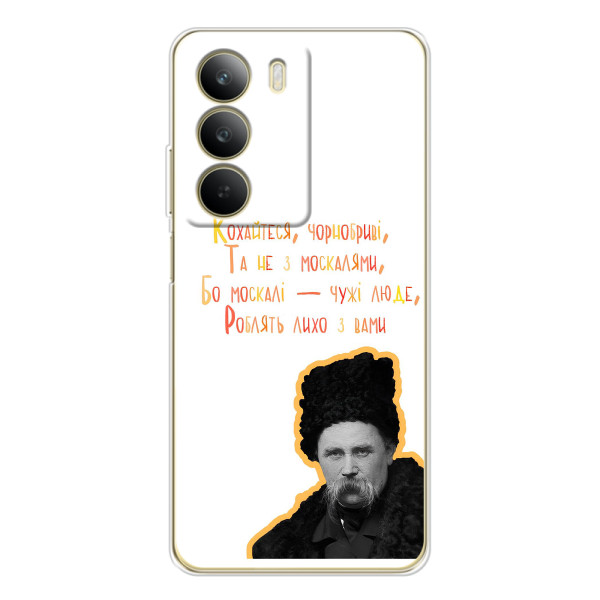 Вишукані чохли AlphaPrint із неповторними принтами Тараса Шевченка - це гармонія мистецтва та захисту для вашого смартфона. Зануртеся у світ поезії та історії, оточуючи ваш пристрій образами великого поета. Виготовлені з високоякісного силікону, чохли Realme C71 забезпечують надійний захист від ударів та подряпин, а матеріал має приємну тактильність і довговічність. Унікальне поєднання мистецтва друку та ретельно підібраного матеріалу гарантує яскраві, стійкі кольори та чіткість деталей друку. Принесіть культурне багатство в повсякденне життя через наші чохли - це не лише захист, а й натхнення.
